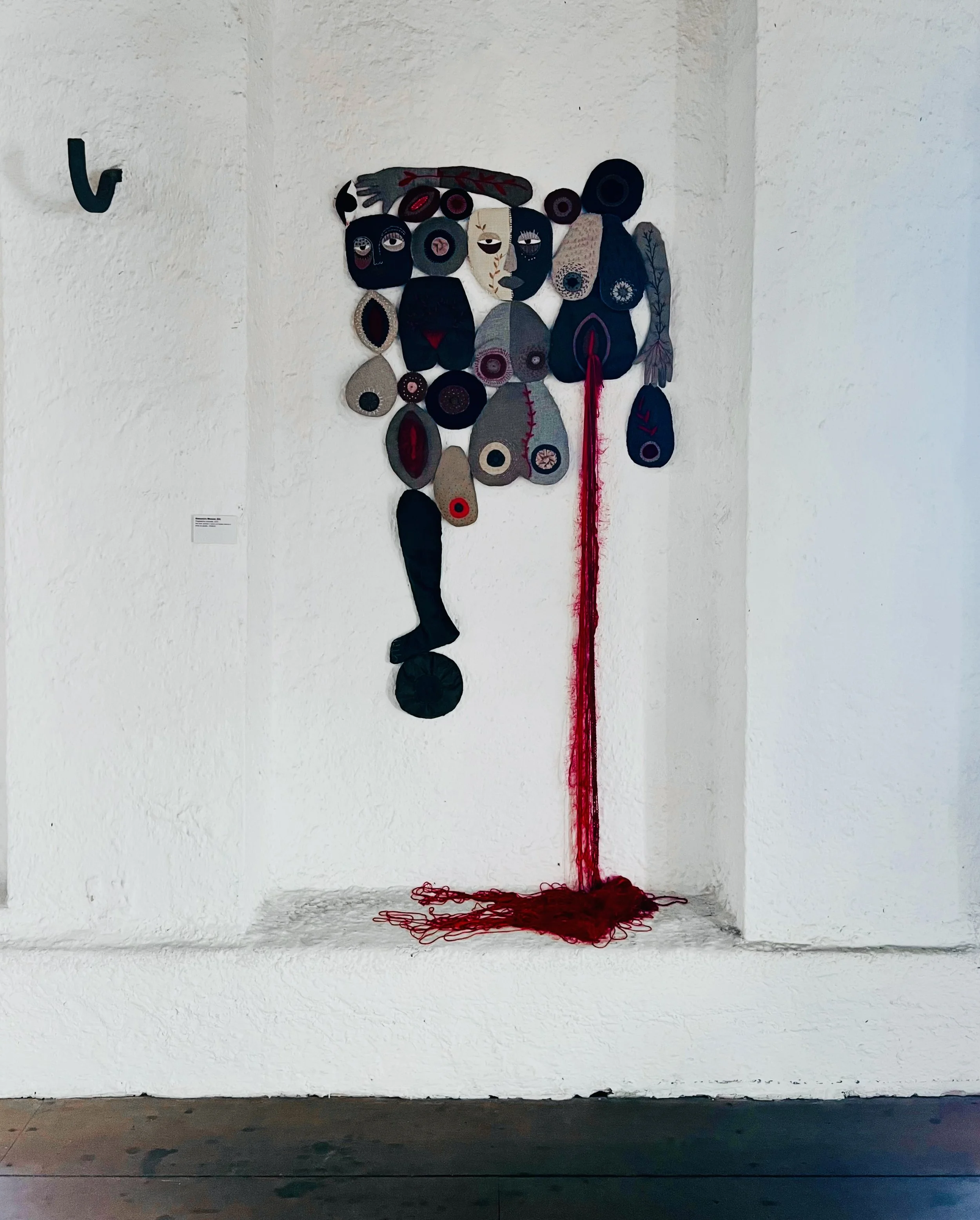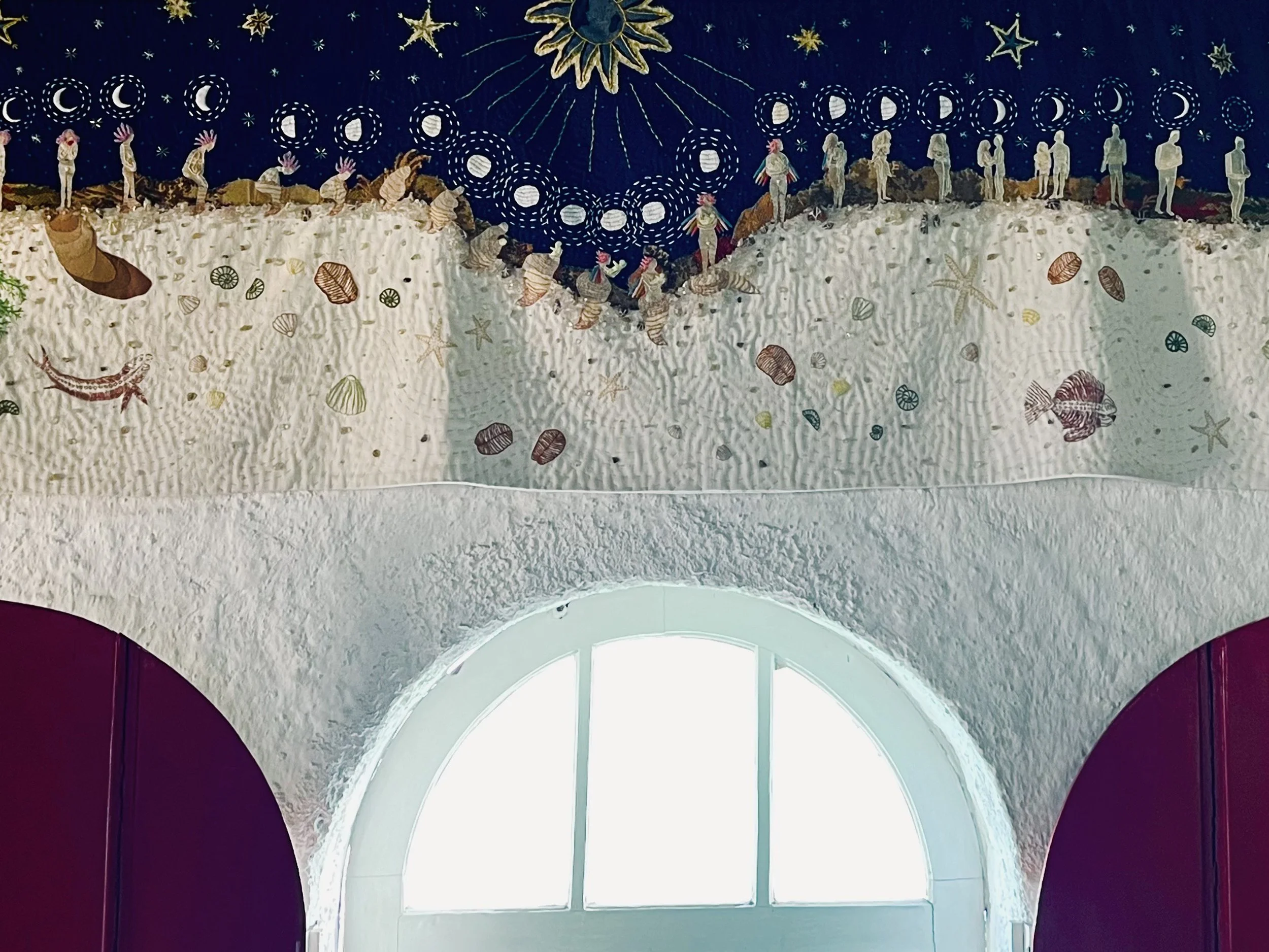 Tecidos variados tingidos naturalmente (pedaços de cortina feita pela avó da artista), tecidos de resíduo têxtil, tapeçaria Gobelin, bordados com pedras e miçangas, 65x234cm