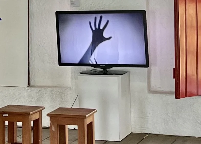 Vídeoperformance “I am Here”, 3’28” + painel (bordado e acrílica sobre tecido) + fotos e objetos