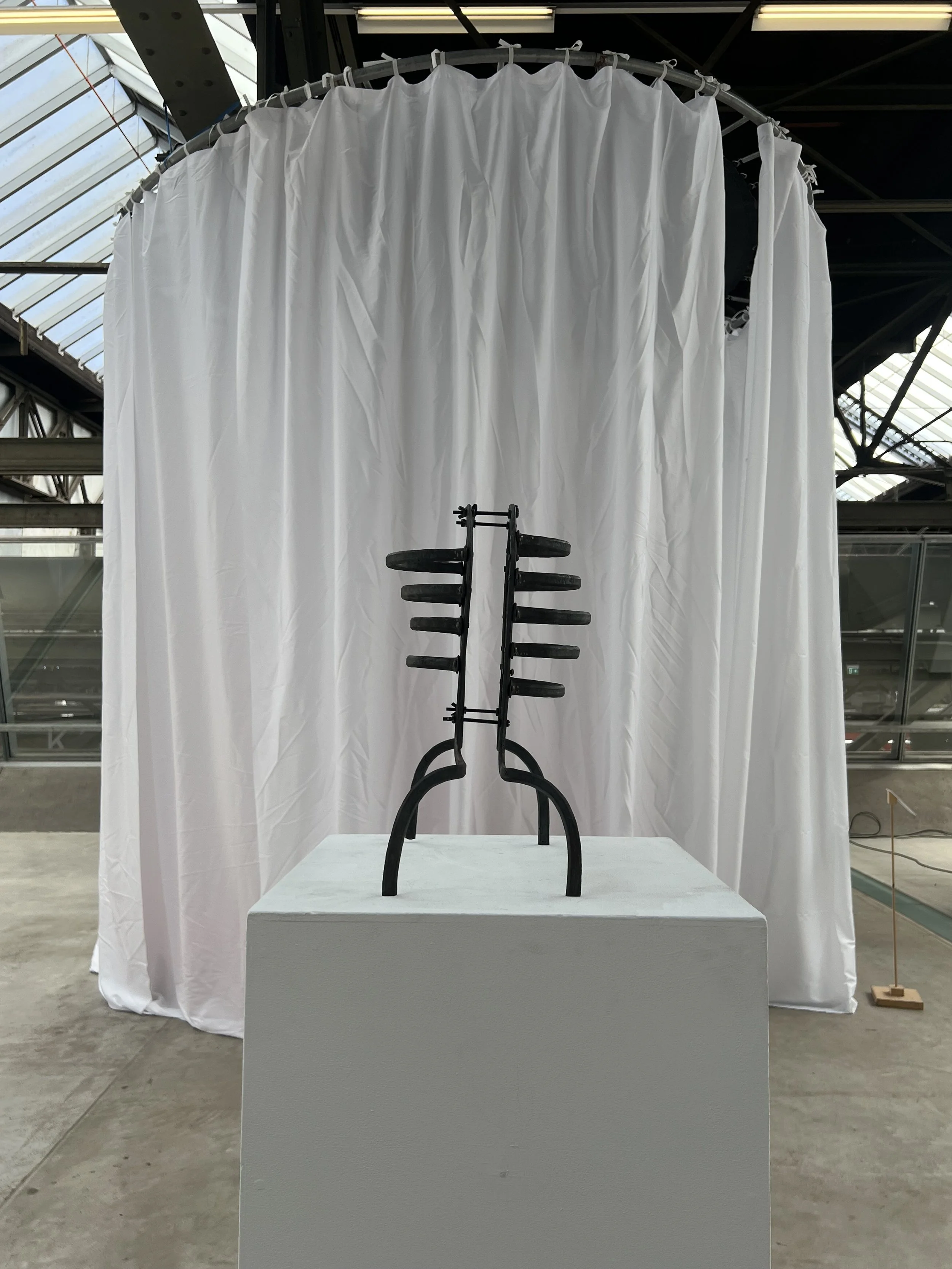 The sculpture is a wearable shield—a kind of cage one can step into. The wearer is enclosed within a structure, insulated from the outside world, yet physically constrained. This limitation hinders movement and interaction with the surrounding environment. The work can be experienced as both protective and restrictive. It becomes a tangible metaphor for daily life: the tension between feeling trapped by external forces and finding security within those very confines. Crafted from forged steel and assembled with rivets, the sculpture’s materiality conveys both strength and weight. Its visual and physical heaviness evokes power, but also a sense of oppression—a reminder that what is offered as protection often doubles as a form of restriction..
