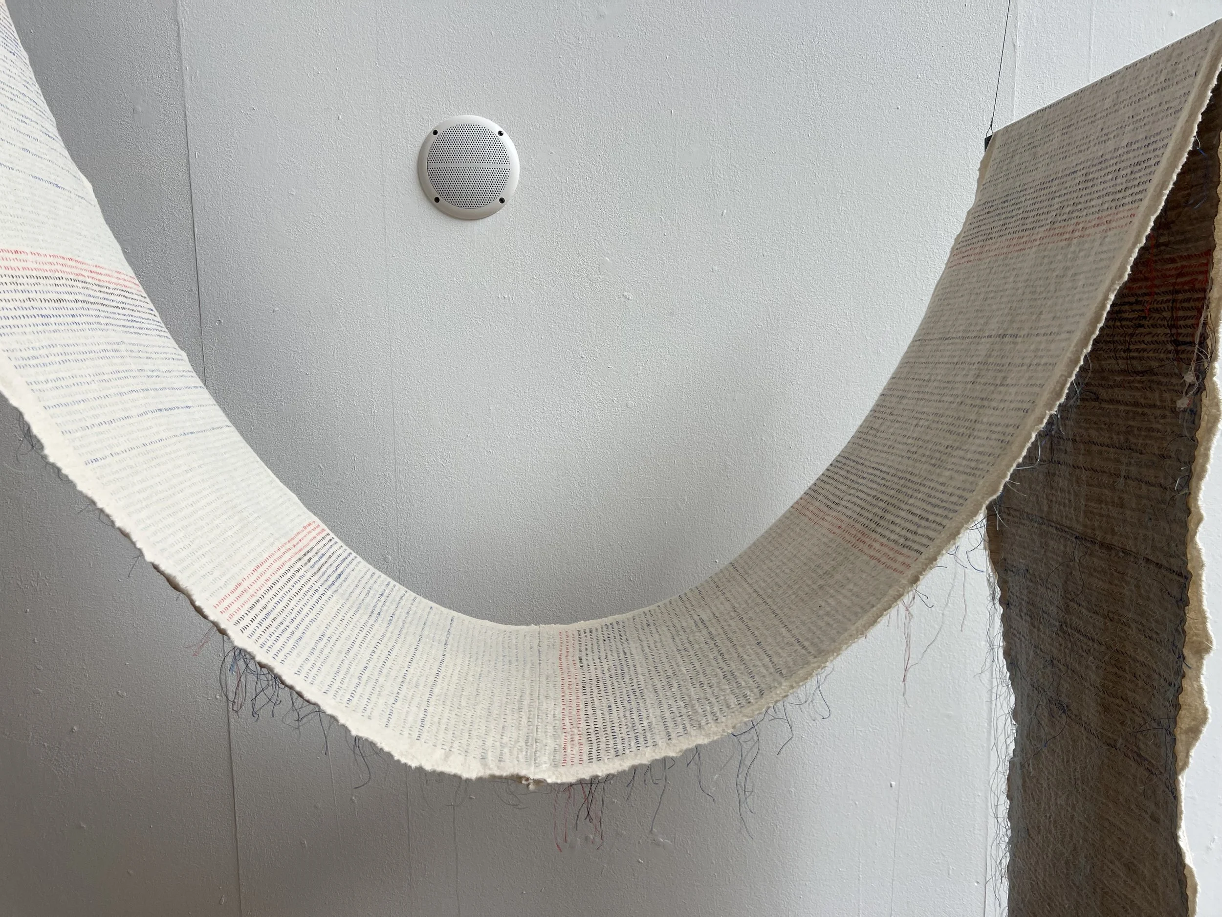 The hand-sewn fabric subtly shifts in color, evoking the trance-like state induced by repetitive labor. Sharp red lines pierce through, marking moments of violent awakening. The steady hum of a sewing machine is at times interrupted—falling silent or giving way to a voice that reveals the hidden toll of the work. The artist draws from her own family history to illuminate the quiet endurance of women in the Portuguese textile industry. Her mother, who began sewing as a child in her grandmother’s factory, was once known to stitch in her sleep—a haunting image of exhaustion, discipline, and silent resilience. By weaving personal memory into collective experience, Garcia pays tribute to the unspoken sacrifices of generations past, bringing visibility to lives shaped by labor and perseverance.