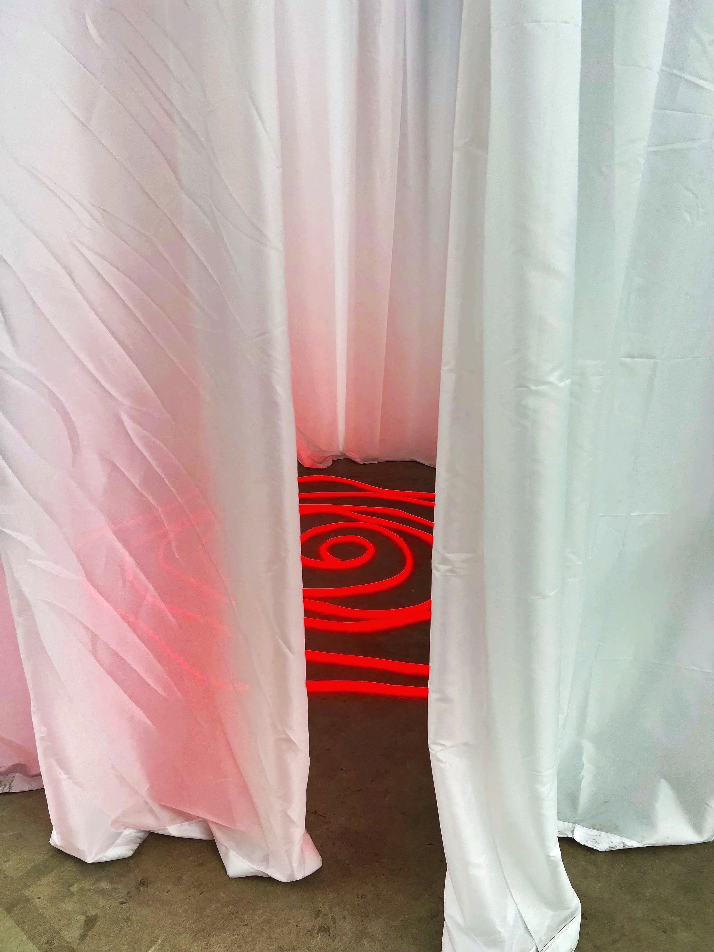 The installation uses flexible neon LED light to create an immersive and dynamic visual experience. The filament, arranged in an organic, flowing form, explores the interplay between light and movement, simultaneously suggesting stillness and motion.