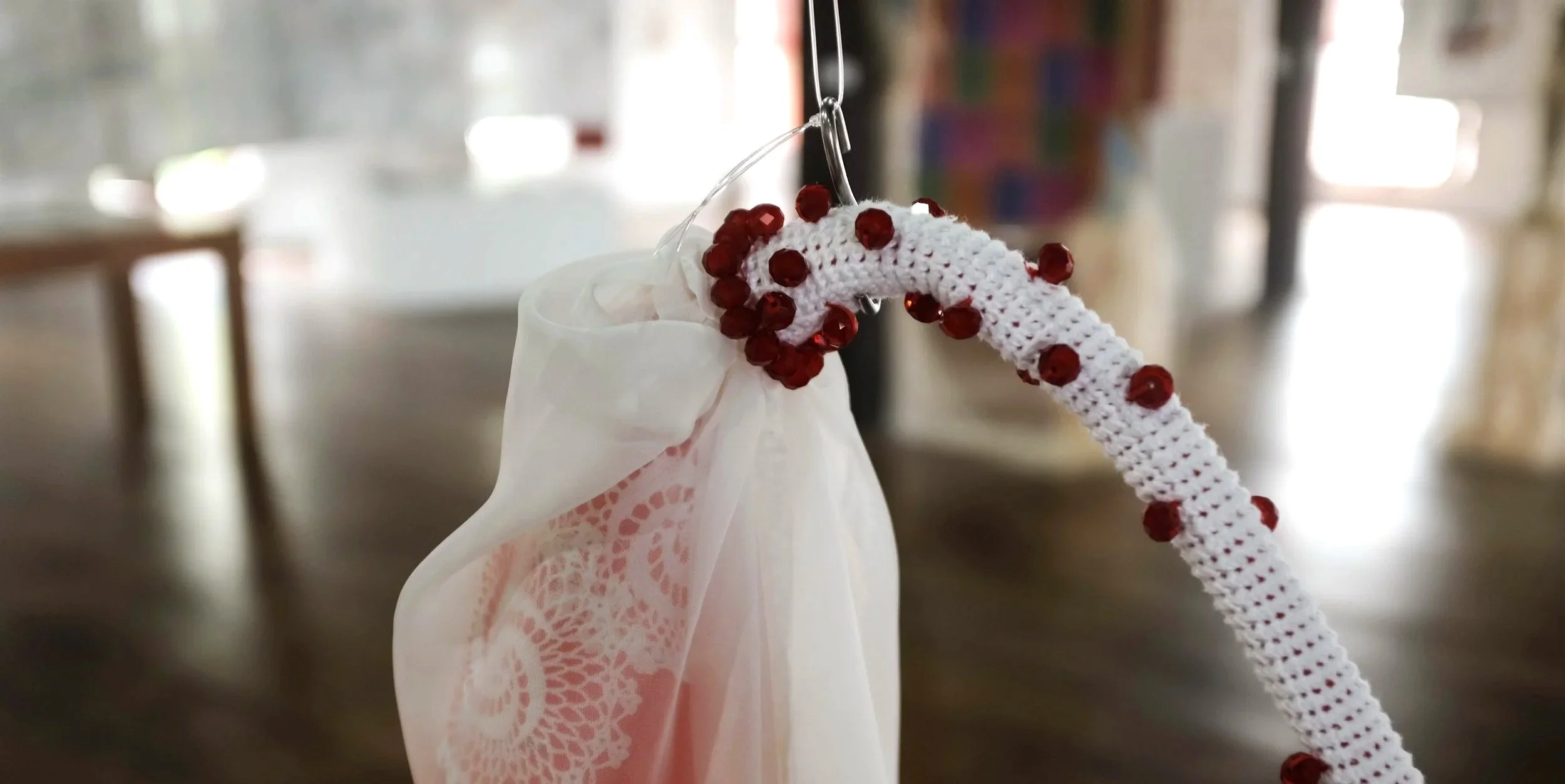 Bordado, crochê e costura e ammarações sobre algodão, organza, voile e vidro