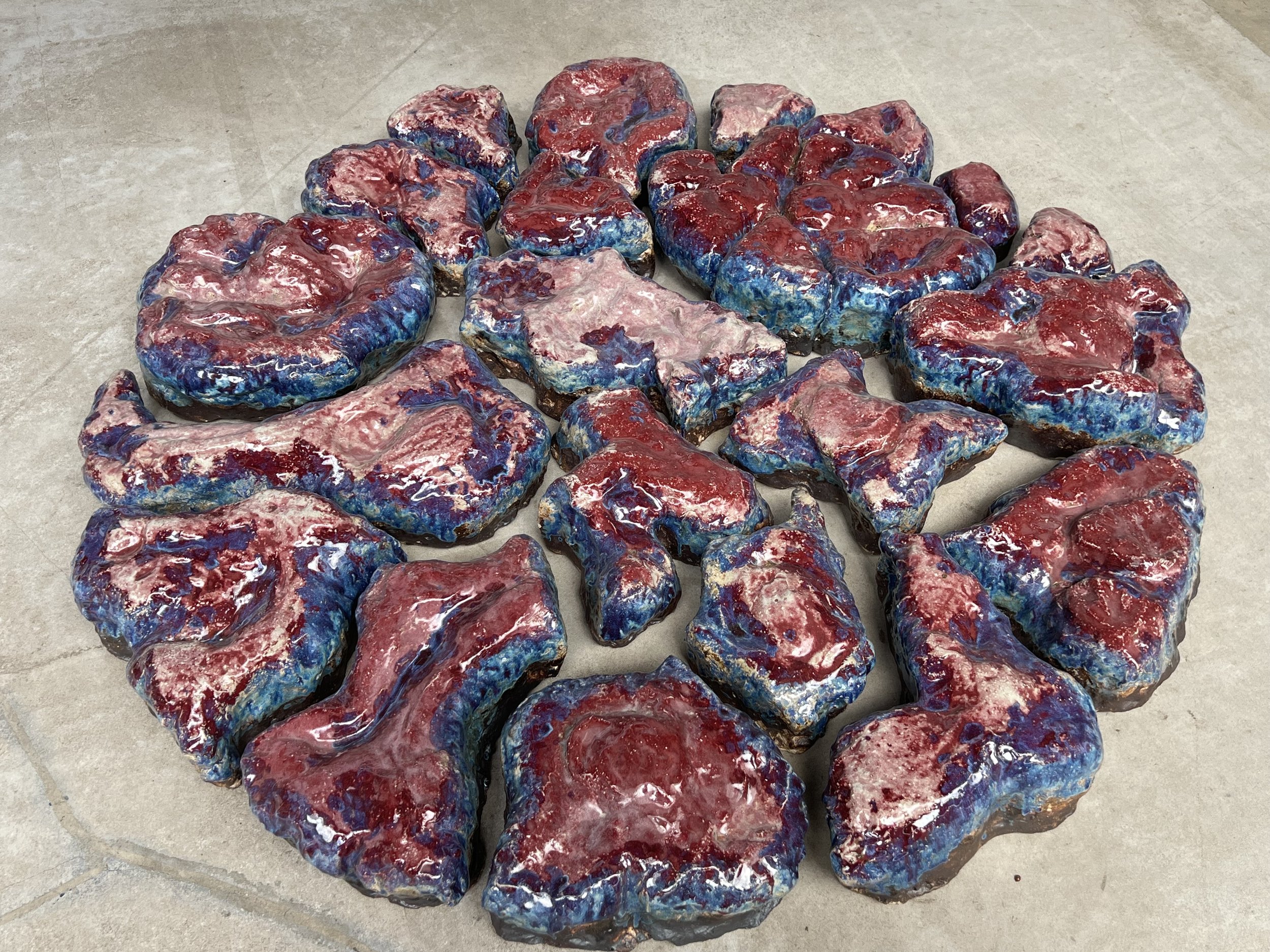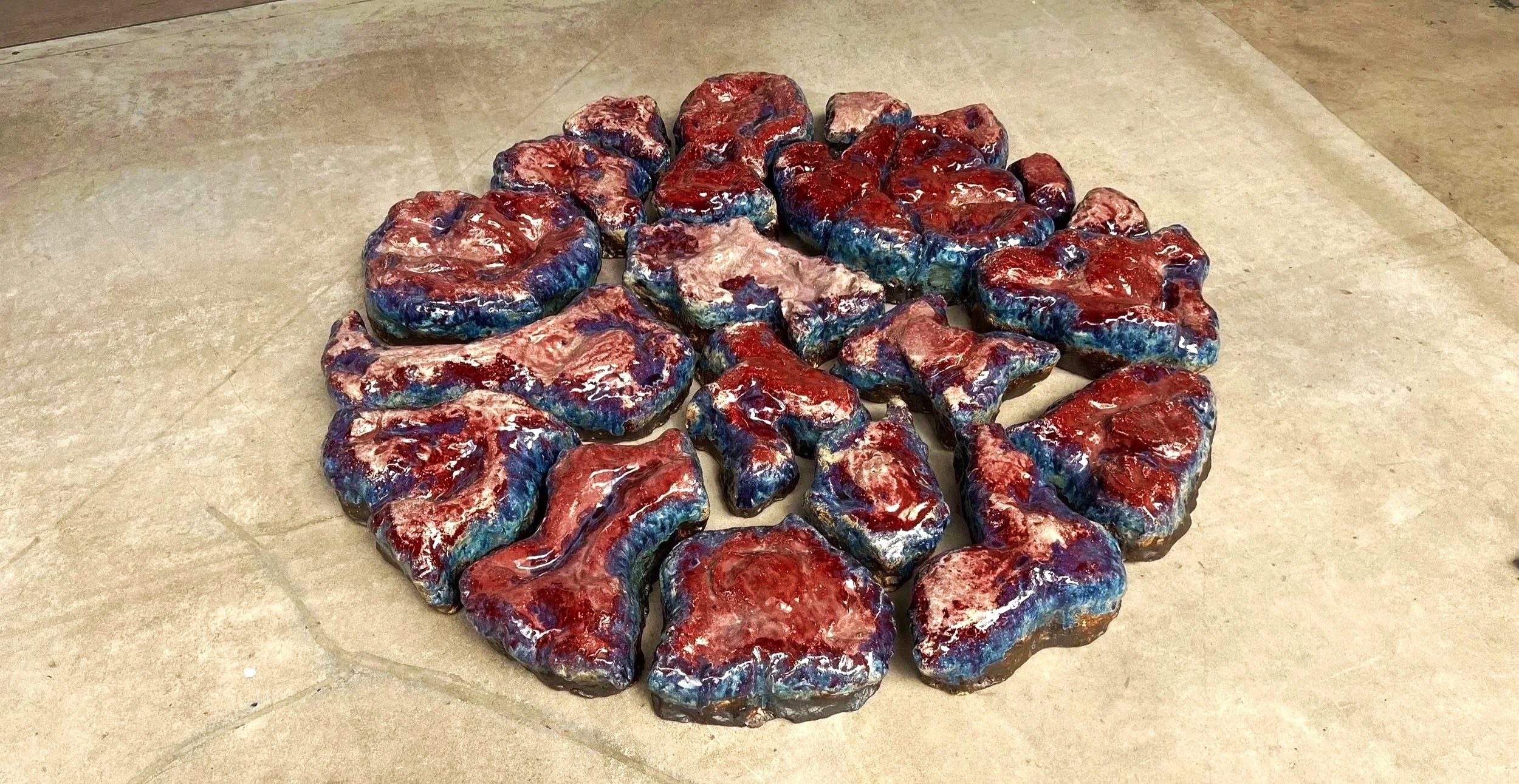 Placenta #69 is glazed with iron, manganese, and copper, then fired in a reduction atmosphere. In this environment, copper carbonate gains electrons, shifting its colour from turquoise to red—an alchemical transformation that mirrors the metamorphosis occurring within the womb.