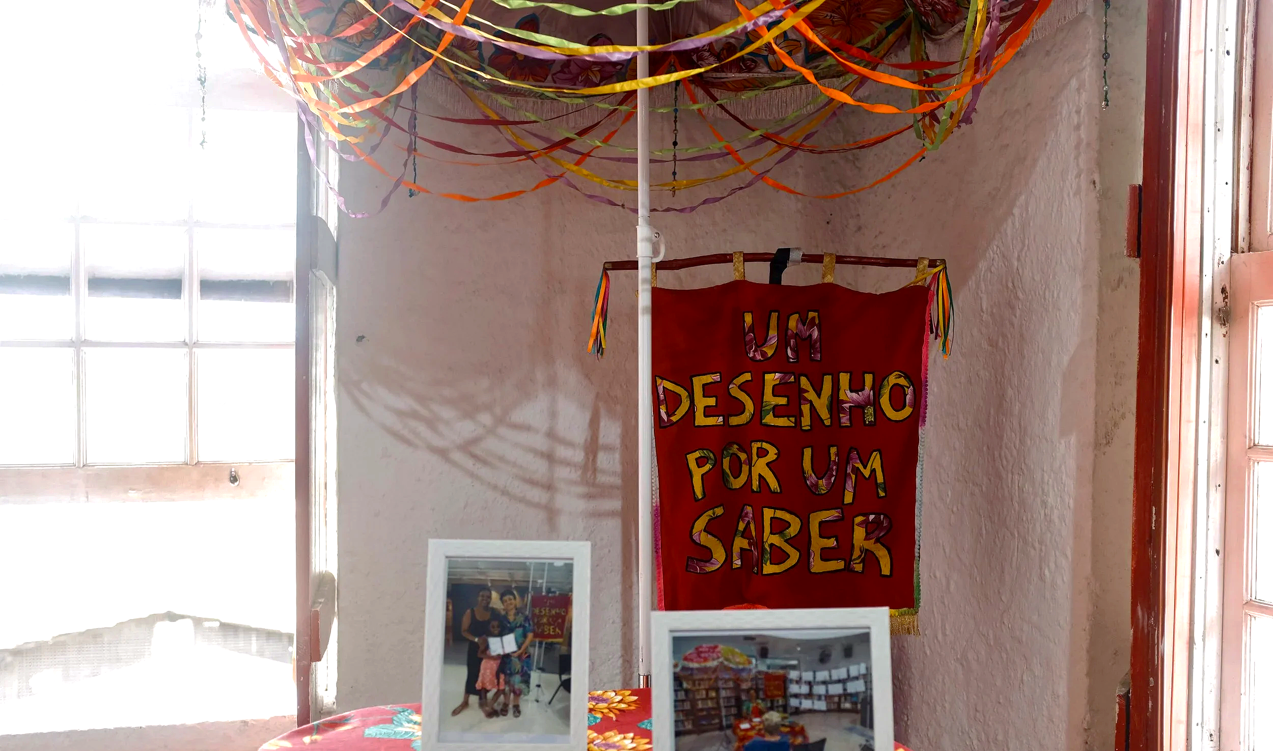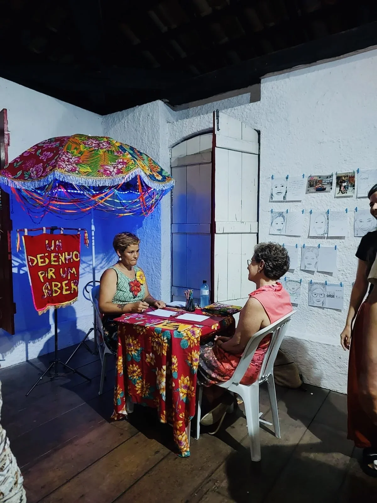 Performance + instalação c mesa e cadeiras, sombreiro, estandarte, papel, grafite, lápis de cor e caneta esferográfica