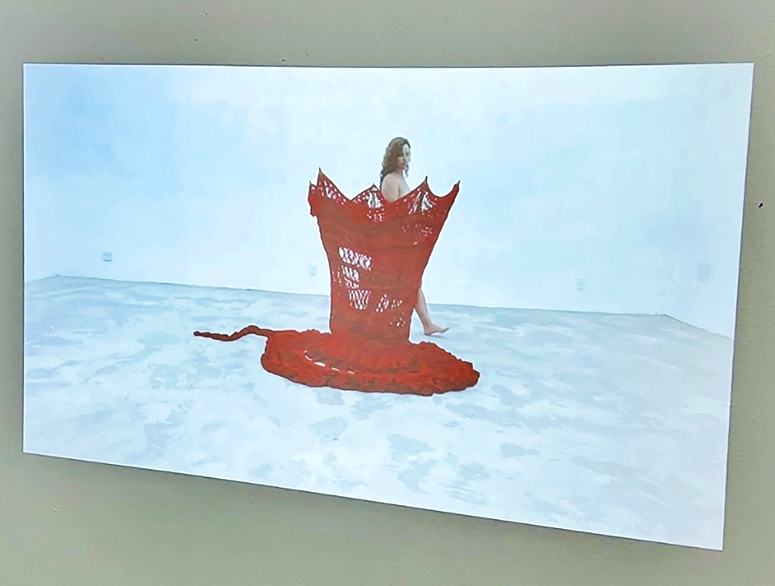 The video performance evokes the loneliness of navigating through bodily transition. Busy weaving its own cocoon, the body becomes trapped and imprisoned within itself. “Secret” was created by the artist herself during her pregnancy. With an open top and giant needles/spears, it refers to the intrusion of social opinions and emotions.