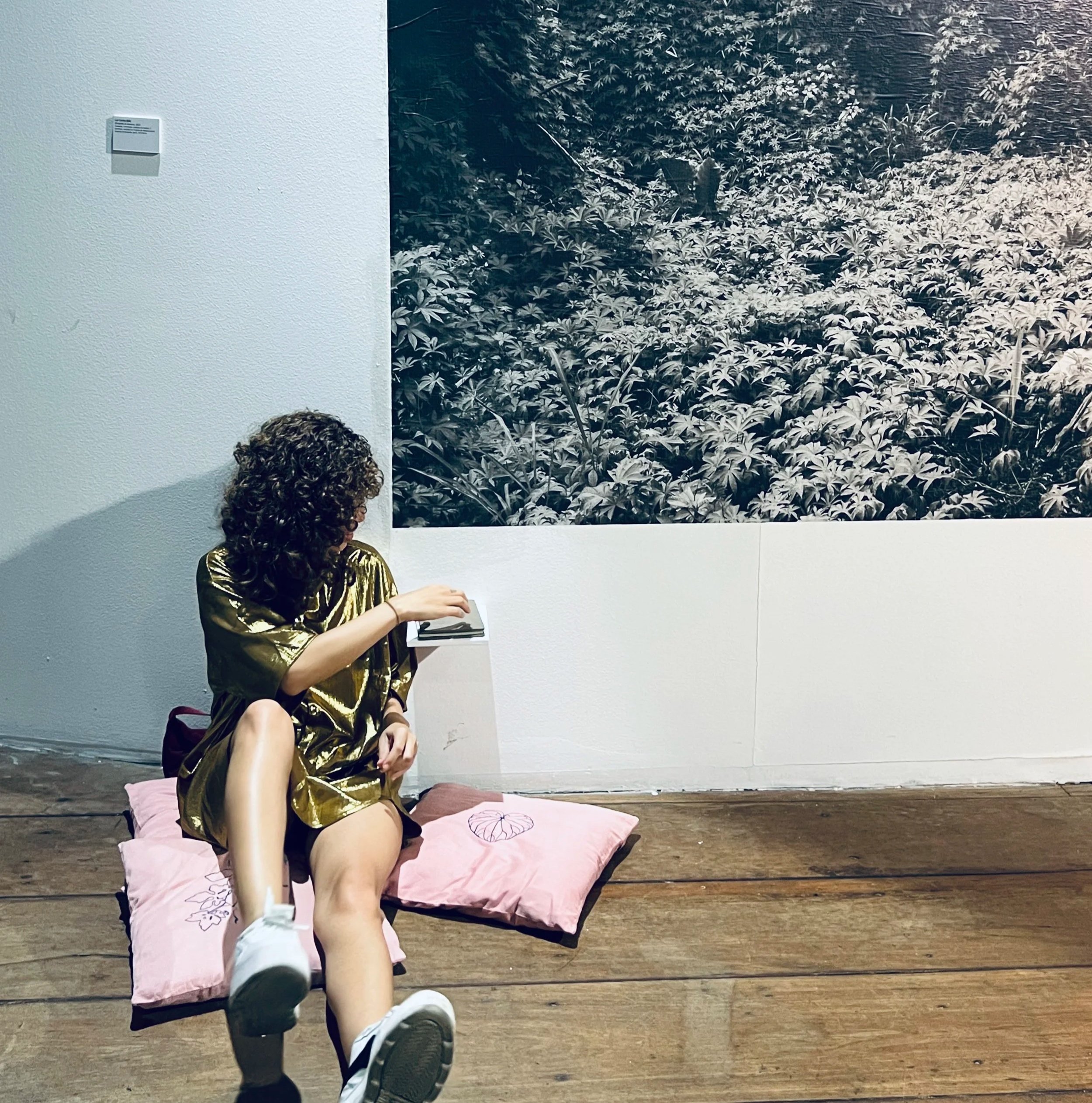 Livro, prateleira de madeira e almofadas; impressão de cianotipia e fotografia lambe-lambe