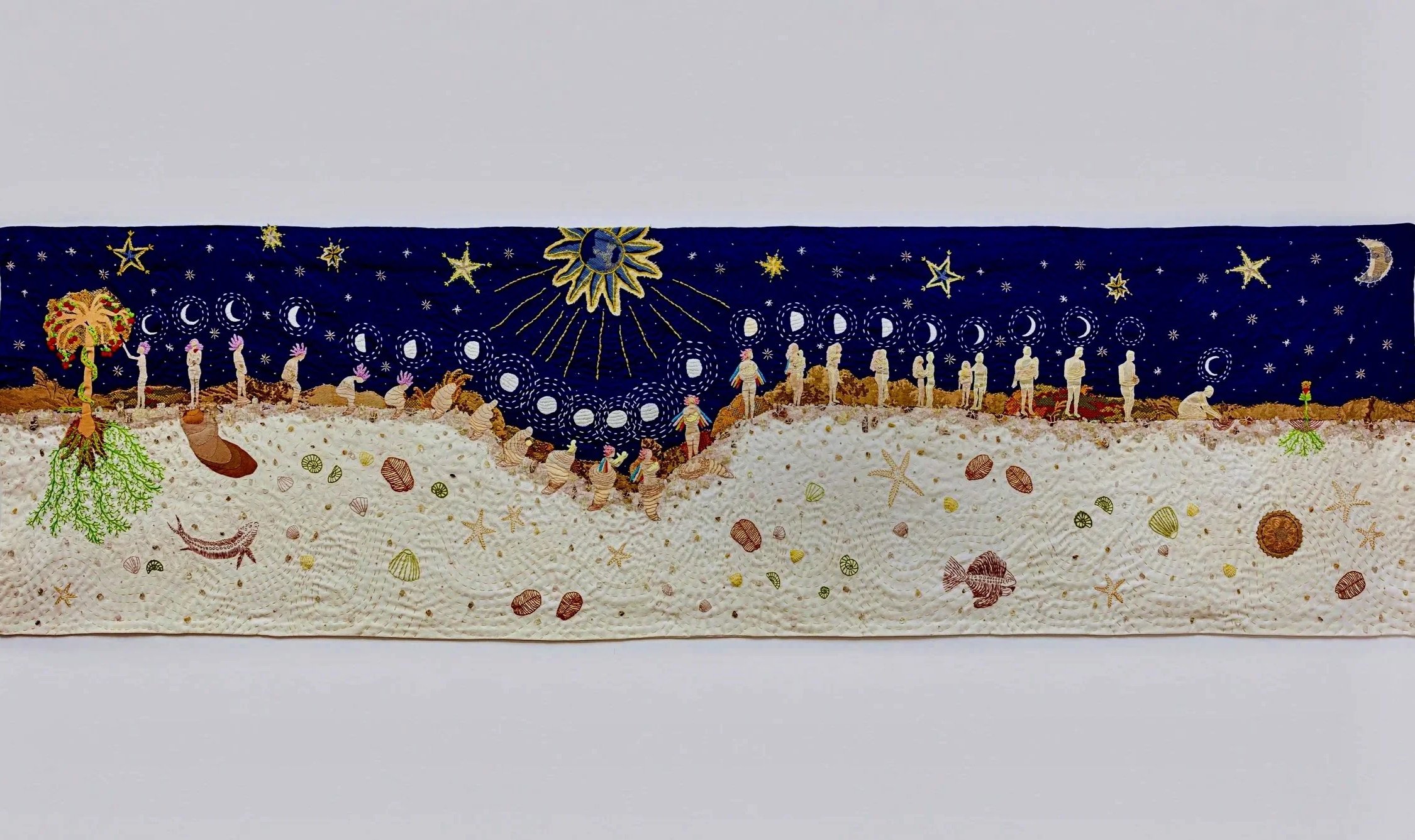 Bordados, pedras e miçangas sobre tecidos variados (incluindo partes de cortina feita pela avó da artista, almofadas, tecidos tingidos naturalmente e tecidos de resíduo têxtil) + tapeçaria Gobelin.