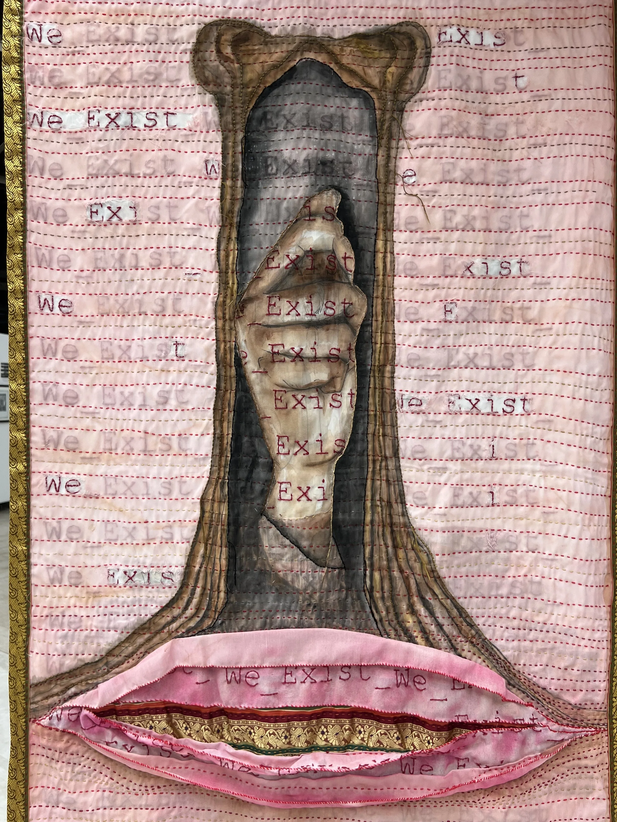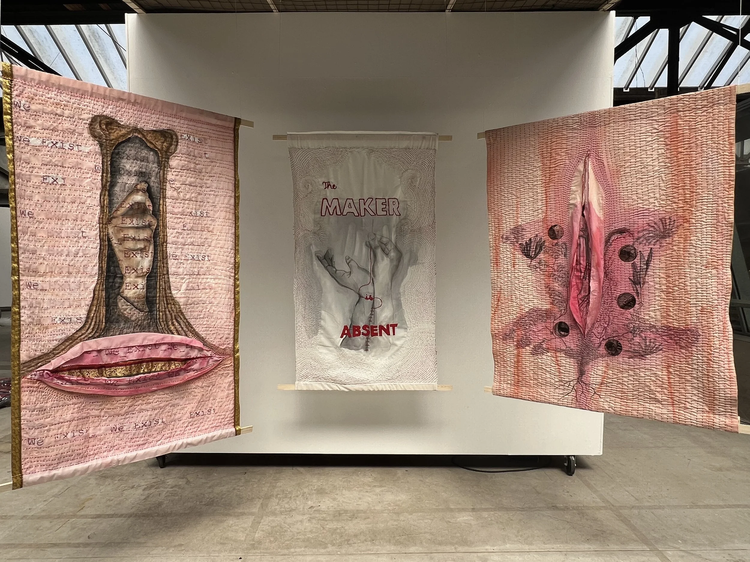 In MAKER ABSENT, Rucha foregrounds female makers, often invisible within capitalist and patriarchal frameworks. Through semi-transparent quilted textiles layered over paintings, she evokes a haunting interplay of light and shadow - revealing wile obscuring.