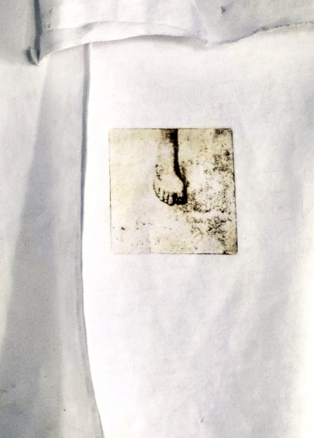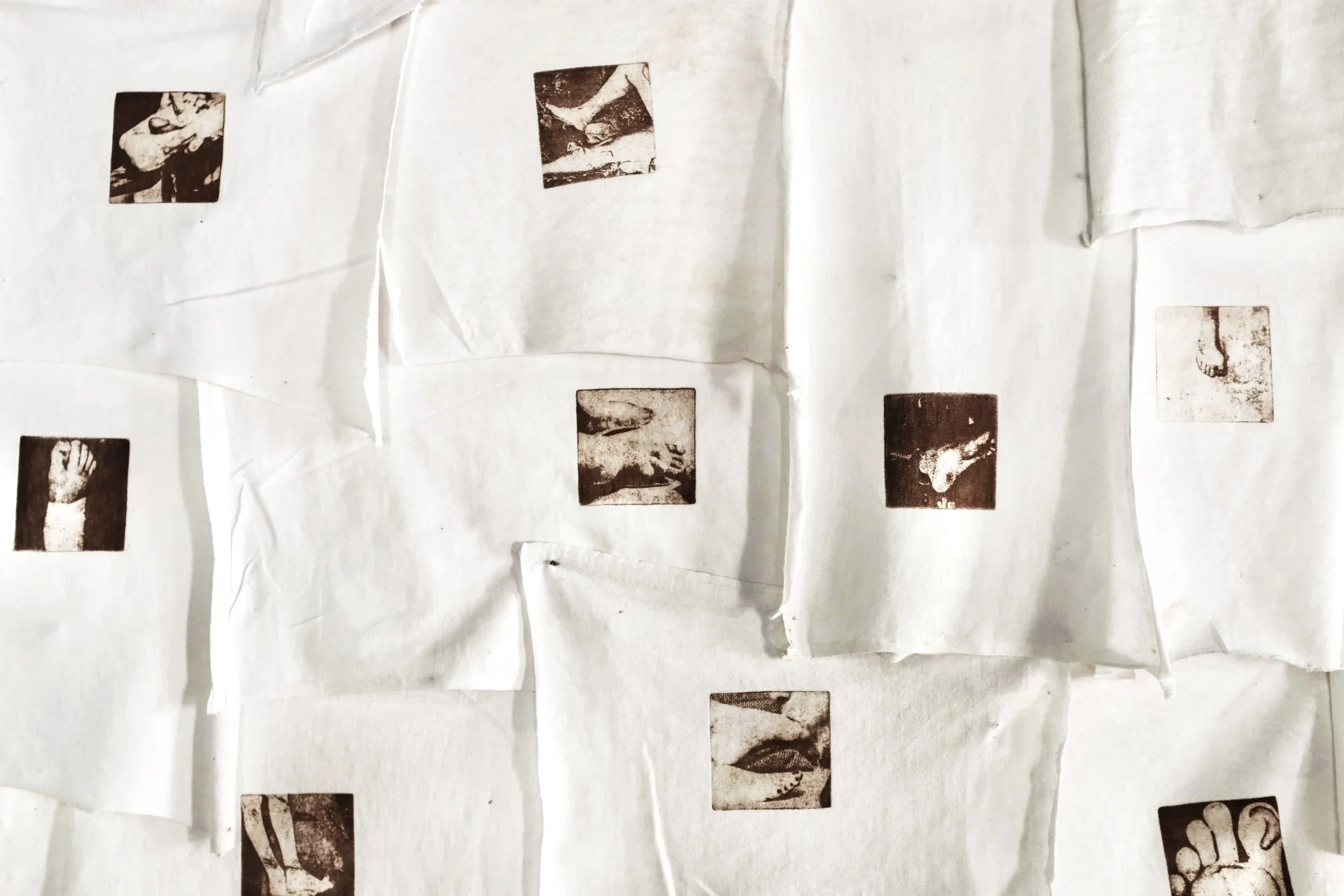 "Pelos pés que se ama” foi o que disse um abusador e agressor numa conversa transformada em carta. Com imagens apropriadas e encontradas, busco articular diferentes mundos a partir dessa frase-gatilho, tipos de violências, situações, estados de espírito. De uma discussão de sentimentos ambíguos, onde o amor traz a violência, e a dor pode aflorar o prazer, surge o painel de fotogravuras apenas dos pés impressas em lençol, com recortes de fotografias de diferentes e complexas situações, remetendo à morte, sexo, doença, de acordo com o próprio 'arquivo-imagético' pessoal de cada uma. O trabalho faz parte de uma pesquisa mais ampla sobre imagens de sofrimentos e como as mesmas impactam a memória e a produção/consumo dessas imagens.